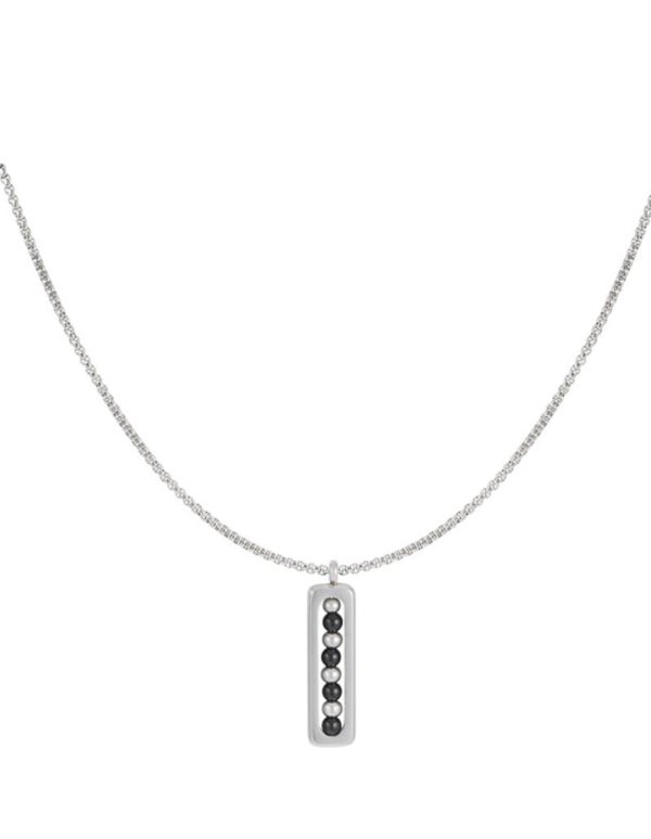 Die Kette besteht aus Edelstahl und Steinen und ist 55 cm lang