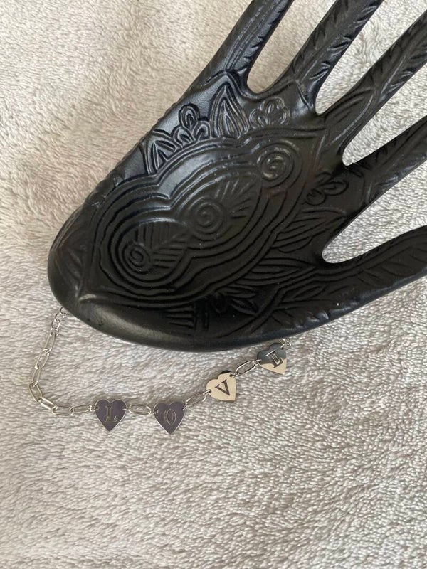 silberfarbenes Armband mit Herzanhängern und dem Schriftzug Love